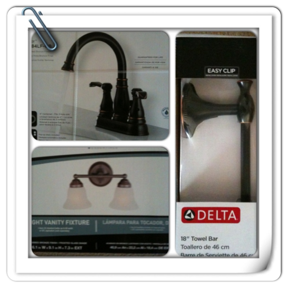 halfbathroomrenovationA new oil rubbed bronze faucet (about $100), a new oil rubbed bronze light fixture (about $30), and a new oil rubbed bronze towel bar (about $30).