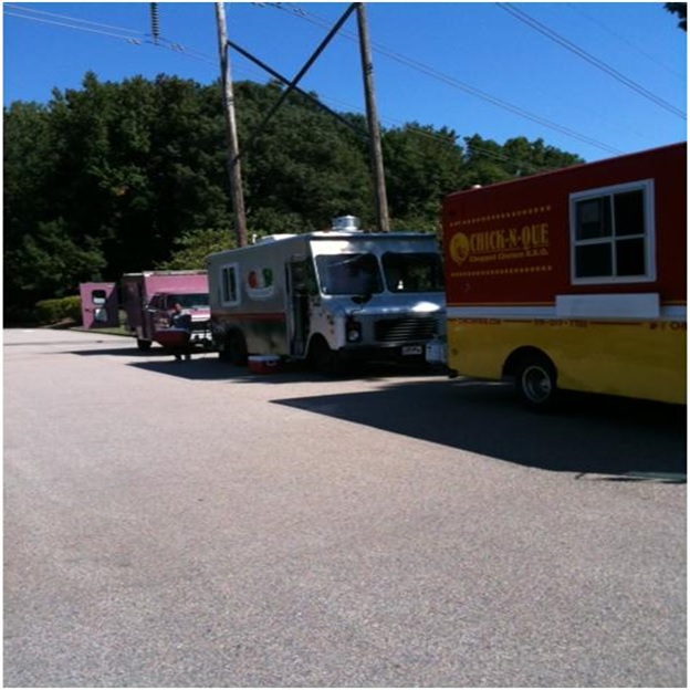 My neighbor, JB, (who happens to work right down the road from me) told me about these food trucks that were going to be in her business parking lot, so I bet you can guess what we did! We got food truck food and picnicked outside! There were four food trucks – Valentino’s, Chick-N-Que, Klausie’s, and SweetStaceyCakes. My neighbor and I both got Klausie’s pizza and then headed to the lake for a lunch outdoors.