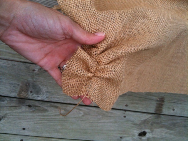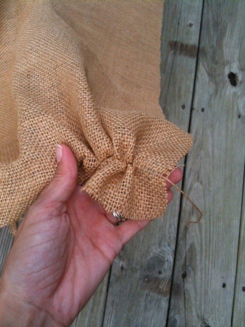 (I was actually measuring the strip of burlap that I needed, but pretend I pulled the second thread over.) You are going to pull on this thread BUT DON’T PULL TOO HARD because the thread WILL break off. Ask me how I know that. =] The burlap will start to bunch and you’ll just have to flatten/pull where it is bunching and keep pulling the thread…