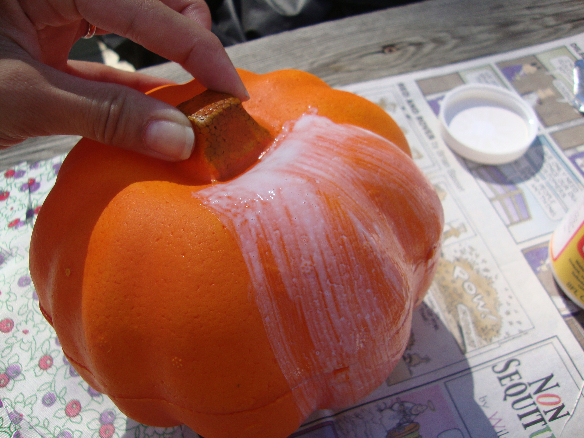 Now, you want to take your Mod Podge and paint a stripe down your pumpkin where your strip of fabric will go. Be pretty generous with this.