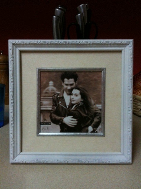 (That’s the picture that came in the frame by the way.) The frame size is a little odd, it’s a 5×5. I plan on printing a quote from our wedding song or a bible verse. I might even Mod Podge* over the existing matting to make it a little more fun and colorful. Or change the matting out altogether… we’ll see!
