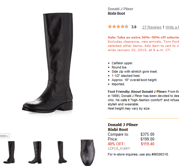 After hitting up the mall I headed over to Marshall’s to look around. I spotted a pair of black (real) leather boots sitting on the clearance rack and ran casually walked over. There were a bunch of clearance stickers on the bottom of the shoes (as in, it just kept getting marked down and down and down). The most recent sticker price was $51! For leather boots, that’s awesome! BUT I still hesitated because I didn’t NEED them. My mom just bought me a pair of (real) leather boots in dark brown for my birthday… So I put the black boots in my cart so I could think about them while I finished looking through the rest of the store. I finally decided that I would get them, because for $51 I just couldn’t pass them up, and I just thought if I woke up the next morning and decided I didn’t want them then I would just return them. When I got home I looked the boots up online by the maker, Donald J. Pliner. These are the boots that I got…