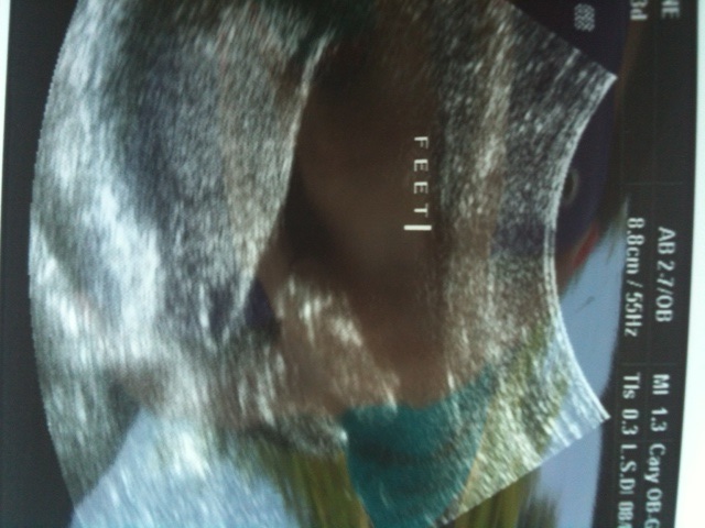 It was so amazing to see everything on the ultrasound. We got to see his little face A LOT – he kept looking at us! He was laying on his back with his hands behind his head just chillin’. =] It was so crazy to see how the doctors can look at different parts of his body and see how he is developing. We checked out his skull, the hemispheres of his brain, his spine, his heart, INSIDE his heart, his little tush, his bladder, arms, legs, etc. EVERYTHING! They even have this thing where they flip a switch and it turns all the fluids ultra red (or something) and you can see the blood being pumped through his veins and into his heart. It was CUH-RAZY!