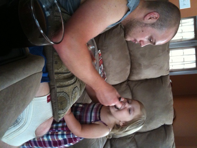 She didn’t seem to appreciate it when Hubs went to put the bowl in the sink when she wasn’t done eating yet. How dare he?! She ran to the stairs and covered her eyes and acted really sad.