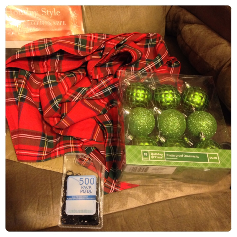 I had another set of red ornaments to do as well, but couldn’t find another tablecloth that I liked, so I went to browse Walmart and guess what I found? A plaid twin flat bed sheet for $4.97. DONE.