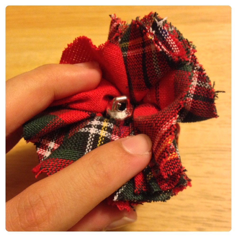 You will need your fabric, ornaments, small rubber bands, and any ribbon you want to decorate with.