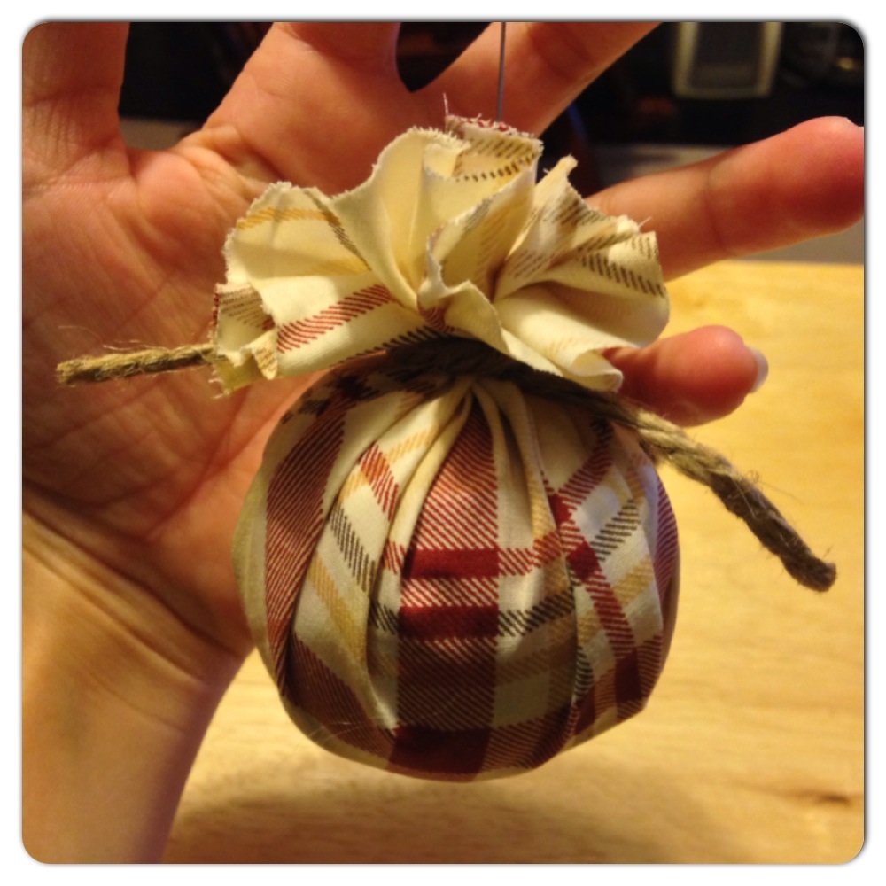 Two and a half years later and I still like the ornaments, but I don’t love them. So what did I do? I scoured Pinterest and Google to see if I could find a way to up-cycle the ones I already have, rather than going out and buying new ones. I knew I wanted a rustic-y feel and I didn’t want to permanently change the ornaments (in case I up-cycled them and didn’t like it). So, spray painting them was out of the question (even though they have some really cute ideas that way!). I came across a “pin” that had fabric wrapped ornaments and I thought, “BINGO!” that’s it. (I basically followed this tutorial over at Shanty-2-Chic.)
