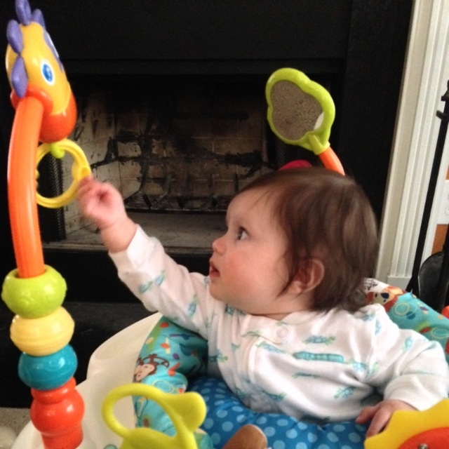 He’s been sitting upright and playing in his Excersaucer for at least a couple of months now, but now he can actually reach ALL of the toys and entertain himself for quite some time.