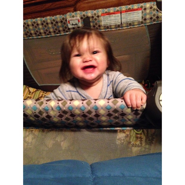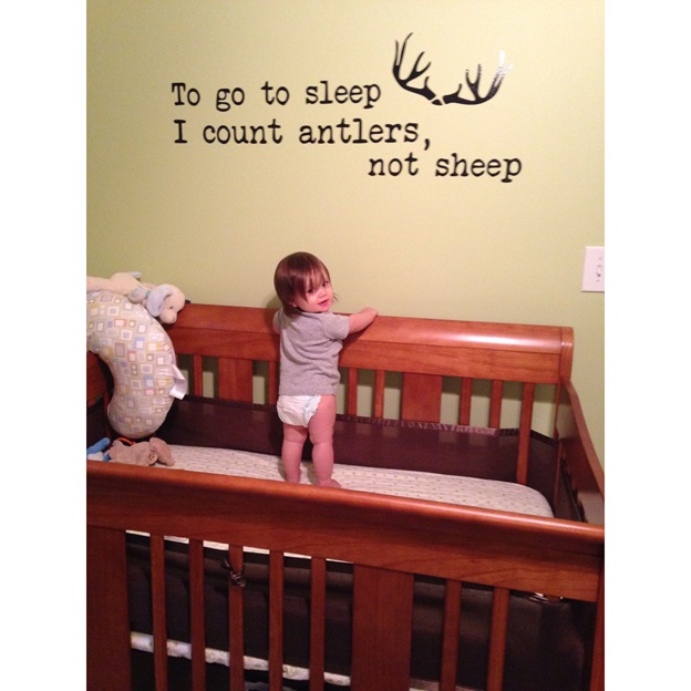 His crib has officially been lowered to the lowest setting. It probably should have been lowered a long time ago, but we were being lazy. It took one scare to realize it was now top priority. I put Peanut in his crib for his nap like I usually do, turned on the monitor, and headed downstairs. Hubs and I were eating lunch and I looked at the monitor and saw that Peanut was stirring, but since he put his head back down I thought he would go back to sleep… WRONG. I looked away from the monitor for a couple of minutes, looked back, and he had pulled himself up and was leaning over the crib rail, head down. All that registered in my head was “leaning, head down”, yelled “OH SNAP!” (except I said the adult version of snap, if you know what I mean), and bolted up the stairs! In my defense, (because being lazy is a dumb excuse for not lowering the crib), I didn’t know he could do that! I didn’t know he could go from laying down to kneeling. I had never seen him do that before! Luckily, I made it up the stairs in time that he didn’t go toppling over, but my heart was racing! We were so lucky he didn’t go over. When he’s kneeling, the crib rail is right under his rib cage, (it was still set at the highest/newborn setting) and he could have easily gone over, head first. Needless to say, the crib was lowered pretty quickly.