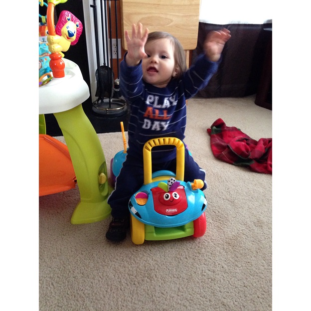 Last night, Peanut was playing with his Sit and Stand toy* and he started pushing it around! I didn’t know he could do that! His little wobbly baby steps are the cutest. ❤
