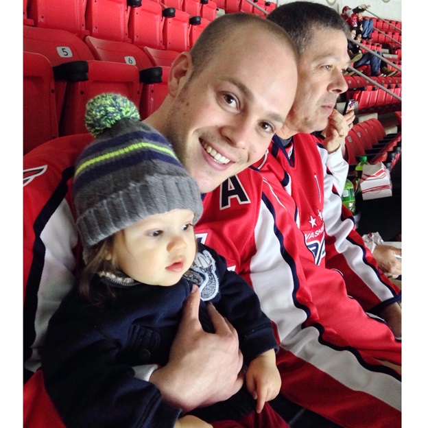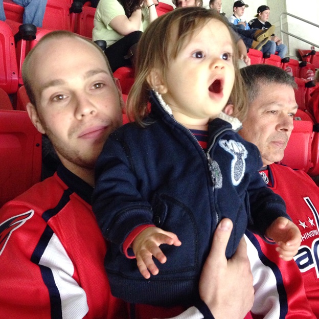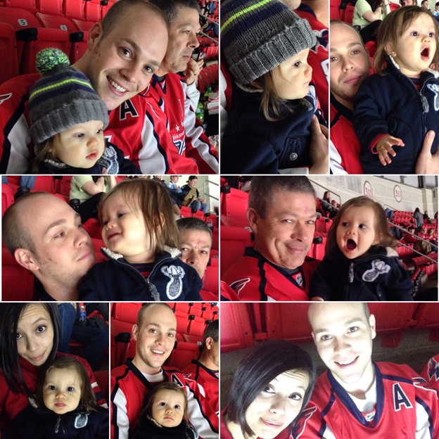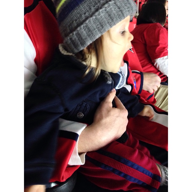 Friday night after work, we (my mother in law, father in law, sister in law, Hubs, and myself) took Peanut to his first hockey game! He did SO great. We opted not to get any noise cancelling headphones, and even though I started worrying about his ears once we got there, I think he did totally fine without them. We sat on the upper deck (which is kind of perfect but it’s not SO high that you can’t see) so I think that helped a little. Maybe? Who knows? I was also a little worried that Peanut would get tired of sitting in our laps and want down to play, but he did SO well. He calmly sat in our lap and watched the game with us. I think he was in awe!