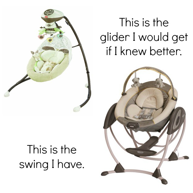 Peanut absolutely loved his swing. I think he liked the cuddliness of it (opposed to just laying flat on his back) and the swinging motion. (I didn’t use the swinging part of the swing until he was about four weeks old. It may have been “first time mommy” worries, but it just seemed too fast even at the lowest setting.) This swing has a reflective mobile and plays different sounds, which Peanut seemed to love. He napped really well in it too. Around 6 months or so, Peanut got really congested and did not want to lay flat in his Pack n Play. He threw a fit whenever I tried to lay him down. It was realllly early in the morning and my tired brain told me to just go downstairs and set him in his swing. At least that way he wouldn’t be laying flat and maybe he’d be able to sleep. It worked. And we both slept peacefully (me on the couch). I will say this though – the swing does take up a lot of floor space. If I have another baby, I think I’d go with the glider instead.